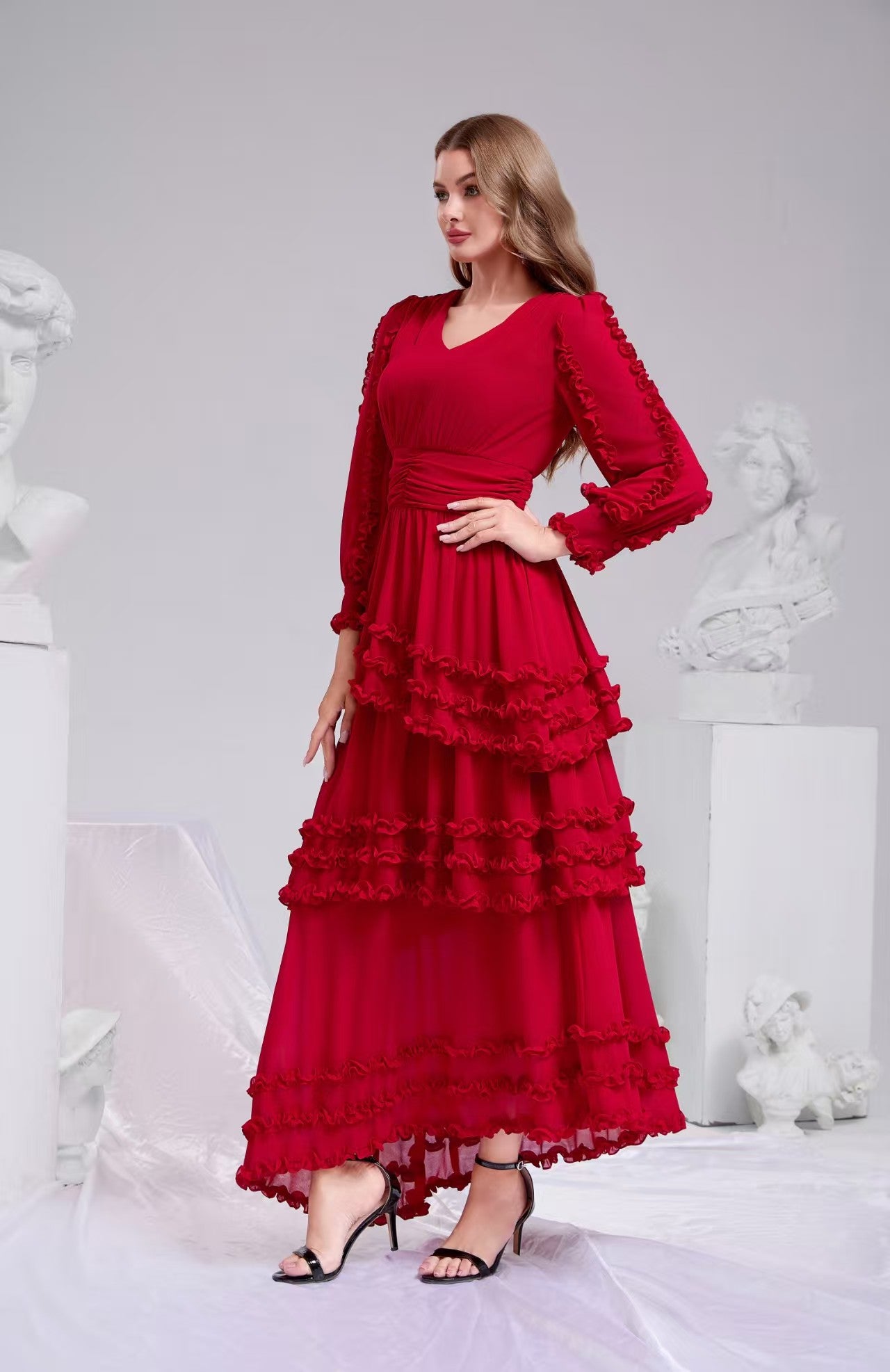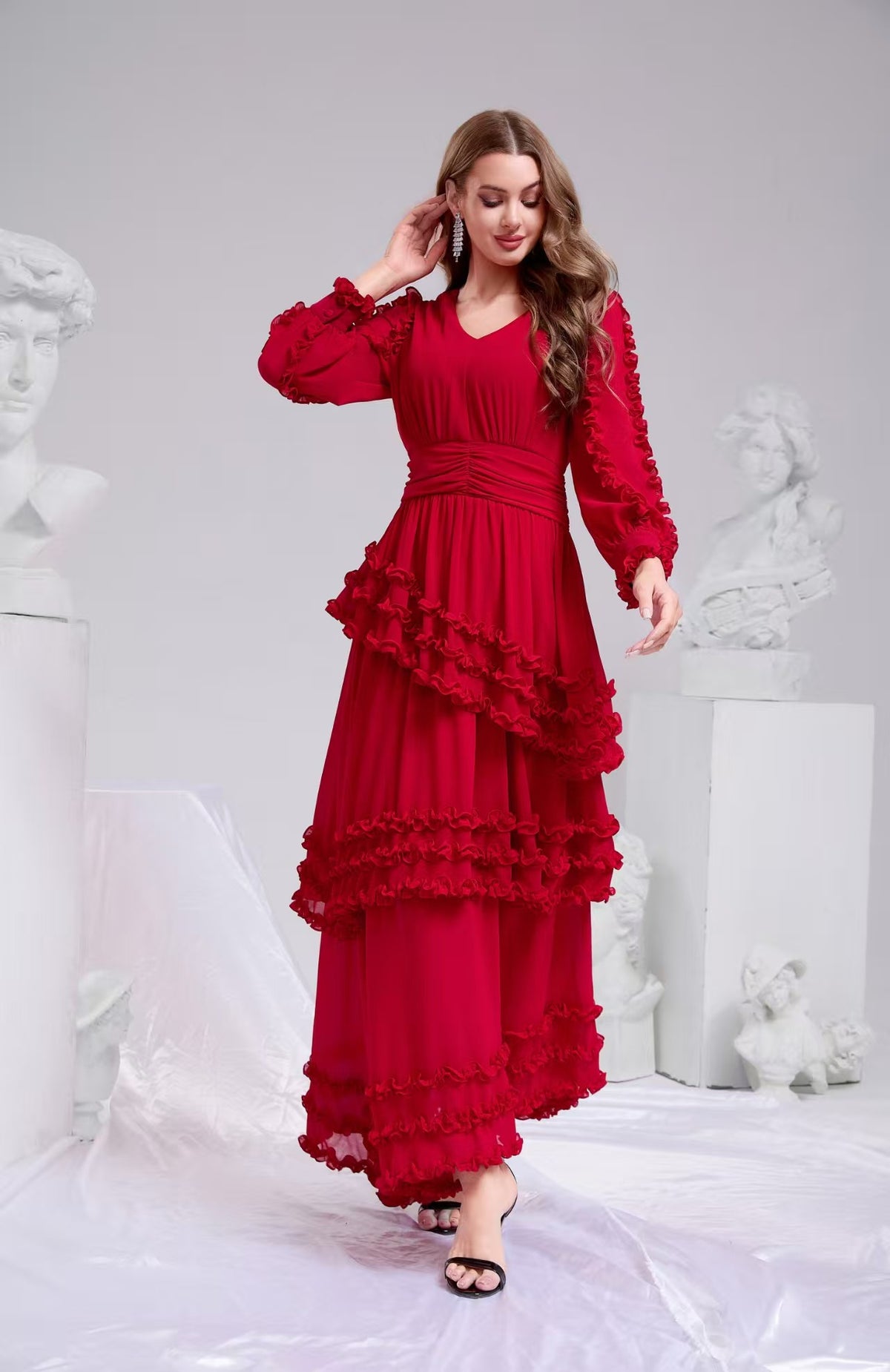 Designed for the woman who appreciates refined details, this maxi dress balances a bold crimson hue with a delicate, ethereal silhouette. The garment is constructed with multiple layers of ruffles that create a beautiful hi-low effect, ensuring you make a memorable entrance at any formal event.